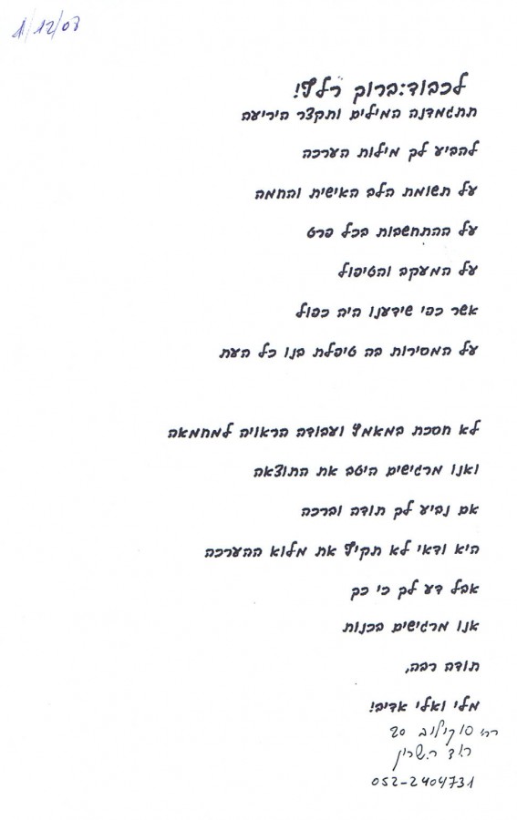 רלף היקר רציתי להביע את התרשמותי מהשירות המעולה שקיבלתי מכל אחד ואחד מאנשי המקצוע שלך. האדיבות.הנכונות לעזור.הגמישות בשעות.המקצועיות.היושר.וכל מה שמסביב ישר כוח!!! נפלא להתקל באנשים טובים