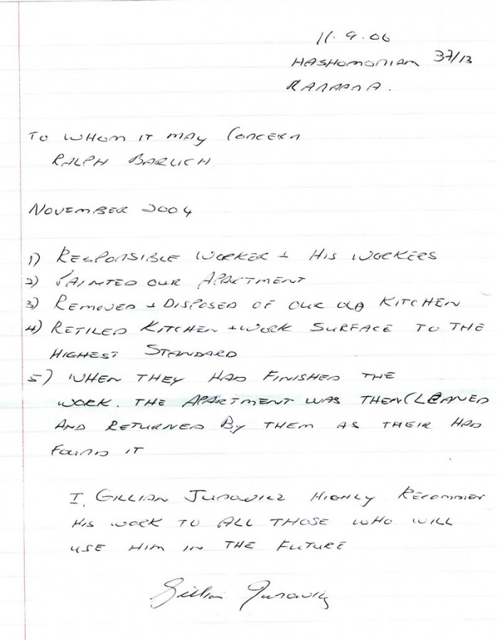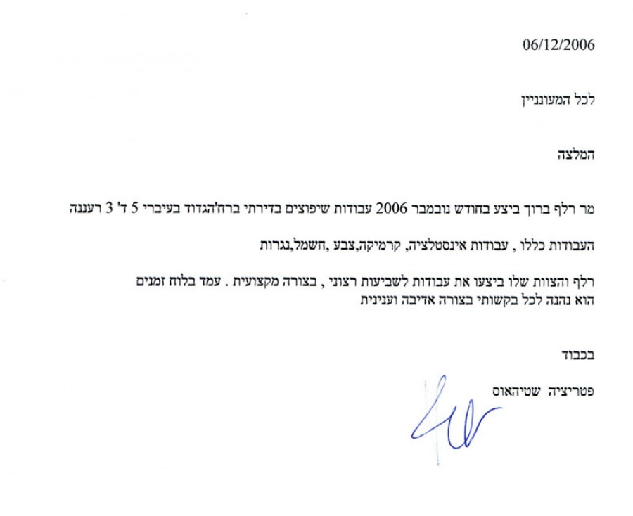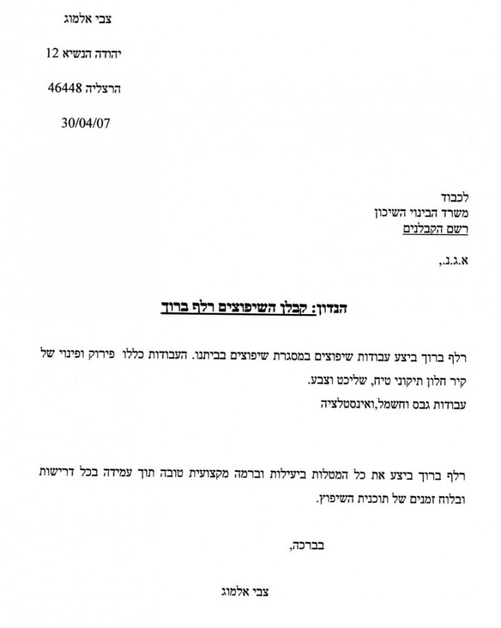 צבי אלמוג יהודה הנשיא 12 הרצליה 46448 30/04/07 לכבוד משרד הבינוי השיכון רשם הקבלנים א.ג.נ. הנדון: קבלן השיפוצים רלף ברוך רלף ברוך ביצע עבודות שיפוצים במסגרת שיפוצים בביתנו. העבודות כללו פירוק ופינוי של קיר חלון תיקוני טיח שליכט וצבע. עבודות גבס וחשמל ואינסטלציה רלף ברוך ביצע את כל המטלות ביעילות וברמה מקצועית טובה תוך עמידה בכל דרישות ובלוח זמנים של תוכנית השיפוץ. בברכה צבי אלמוג