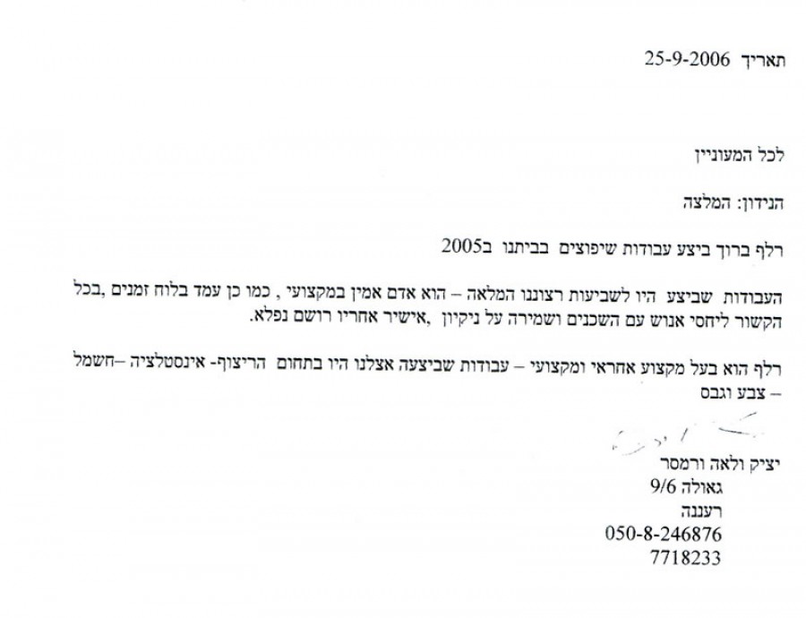 עלינו לציין במכתב ההמלצה על רלף כחוויה מתקנת. א. עמידה נאמנה בלוח זמנים. ב. התיעצות בונה ויוצרת כדי להגיע לפתרון הבעיה לעומקה. ג. עבודה נקיה ומסודרת. אכן כחוויה מתקנת. ד.מחירים אמיתיים וסבירים בהתאם. ה. תוצאות טובות לעבודה