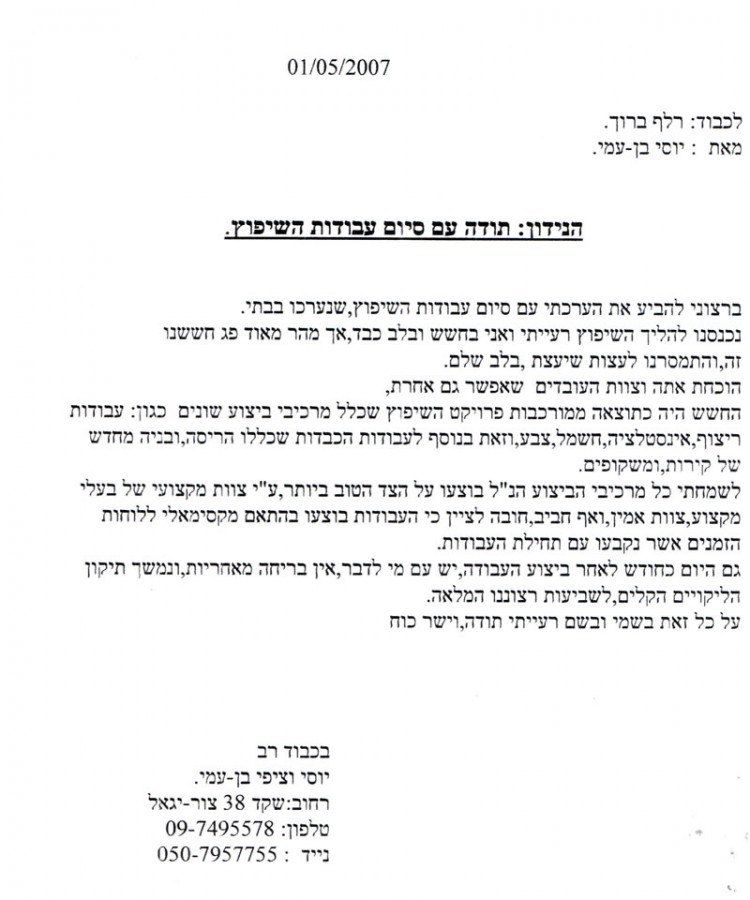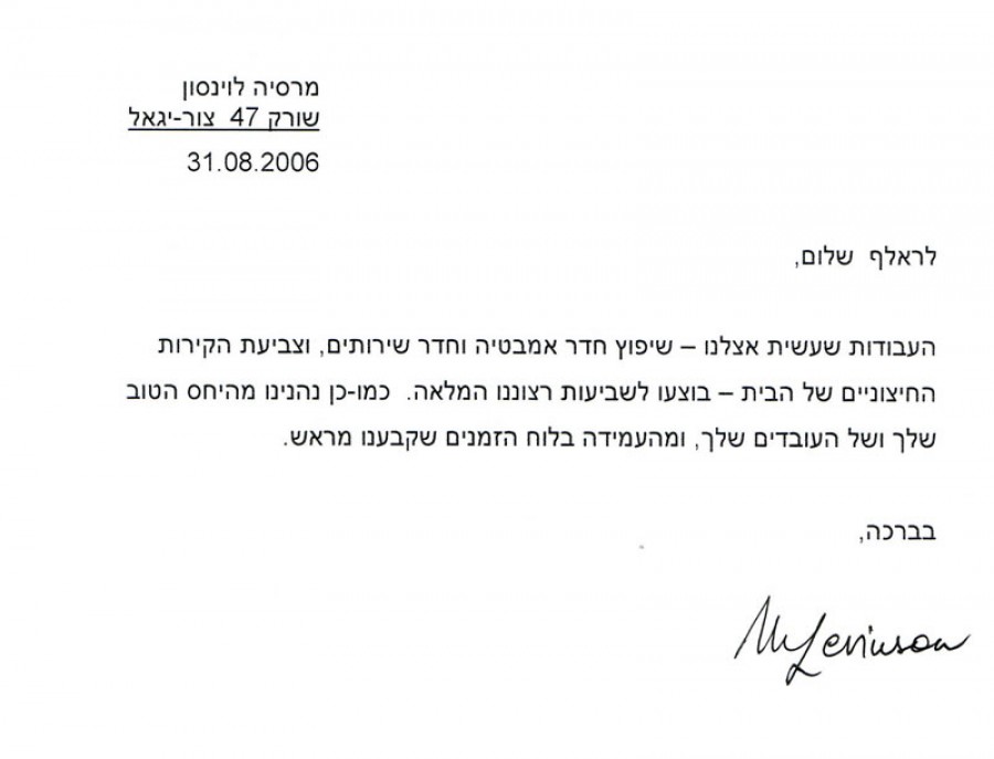 לרלף היקר תודה רבה על המאמץ העבודה הדיוק והתוצאות בשיפוץ שעשית אצלנו לפני פסח האחרון. הגעת לאחר שהתקשרנו אליך (לפי המלצה של חברת המטבחים) בדקה ה-90 ועשית הכל כדי לעמוד בלוח הזמנים הצפוף. עשית יישור קירות עם שפכטל אמריקאי טיח צבע קרמיקה רובה התאמות חשמל התקנות של ברזים קידוחים ואטימת מרפסת. הכל נעשה במקצועיות – וגם תודות לעובדים שלך ובמיוחד לציון בעל ידי הזהב – וברוח טובה והרבה השקעה. ובנוסף אני חייב לתת תודה על מה שמצאת במרפסת: לאחר שעבר מספר לא קטן של מומחים בבית למצוא מקור של רטיבות שהטרידה אותנו במשך שנים וכל ההצעות שקיבלנו היו לסתום עם שיש או בטון (הצעות לא כל כך מעשיות) אתה גילית 2 נקודות די גדולות פתוחות (ומוסתרות מאוד) בקיר המרפסת שאף אחד לא ראה. מצאת את הבעיה ותקנת במקצועיות רבה. כל הכבוד! אודי לוין